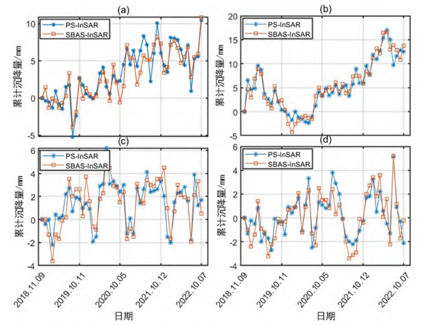 图2 PS-InSAR与SBAS-InSAR特征点累积沉降