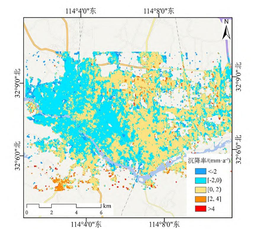 图1利用SBAS-InSAR技术的信阳市中心城区沉降年变率