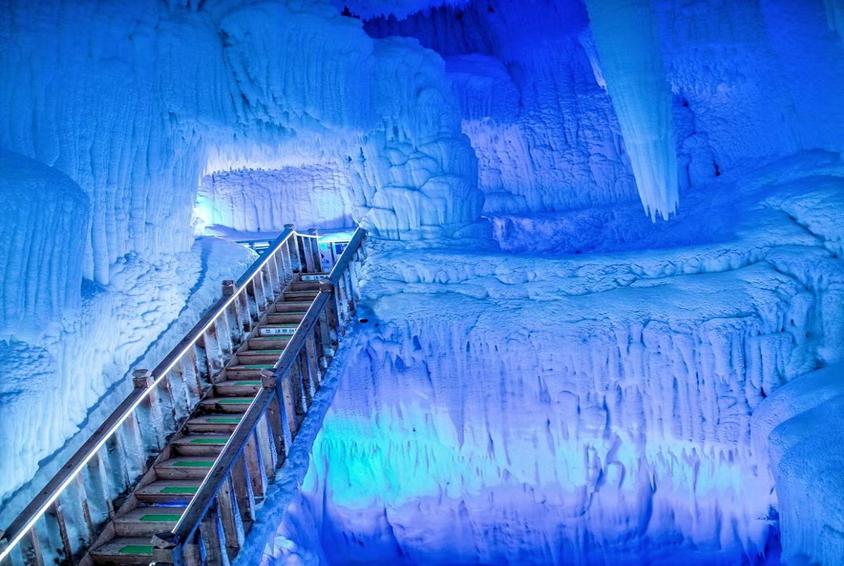 万年冰洞实际上是一处石灰岩溶洞,洞内有冰柱、冰石笋、冰钟乳石、冰涡管、冰花、冰葡萄、冰的结晶片等。堪称一个冰的世界,在五彩灯光的照射下,呈现出梦幻般的景象。冰洞入口是一条4米多长的冰隧道,冰洞的第二层,右侧是一根直通洞顶高达10余米的冰柱,被称为“定洞神针”。其中一面美轮美奂、晶莹剔透的大冰帘,叫“玉帘垂空”,玉帘的正面则是一条大冰瀑。