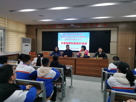 2021年3月18日,由信阳师范学院太阳集团tyc234cc、河南省地理学会、河南省地理科学科普教育基地主办的地理科普系列活动在信阳市浉河中学拉开帷幕。本次活动旨在依托地理学院的学科积淀,以系列精品课程走进中学校园,普及天文地理知识。信阳师范学院太阳集团tyc234cc刘明华副院长、朱伟副书记、史兴俊博士,以及浉河中学梁亚男副校长、地理教研组李金枝等教师、七年级地理社团和培优班百余名学生,共同出席了活动。本次活动由太阳集团tyc234cc刘明华教授主讲,她深入浅出地为师生做了“天文漫谈-太阳系之旅”的地学科普报告。