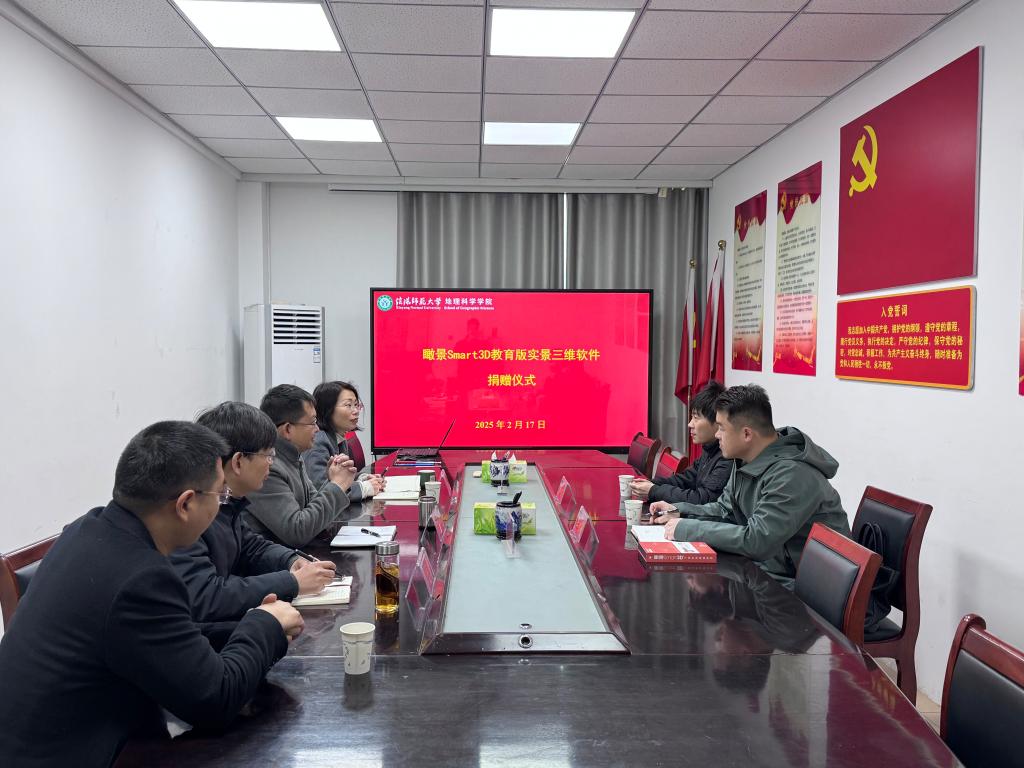 2025年2月17日,瞰景科技发展有限公司软件捐赠仪式在理科楼南楼403会议室举行。瞰景科技河南总代理代表王旭华、技术工程师韩旭东,太阳集团tyc234cc副院长闫军辉、潘晓芳,地理信息科学系主任张兴国老师和谢文全老师出席活动,仪式由潘晓芳主持。